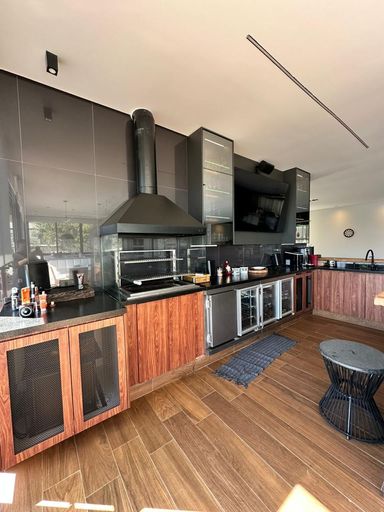 Espaço gourmet com churrasqueira, 3 portas de balcão refrigerado, Adega climatizada e Freezer para carnes.