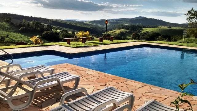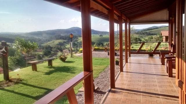 Área externa com varanda com uma vista impecável para as montanhas e vales de Piracaia.